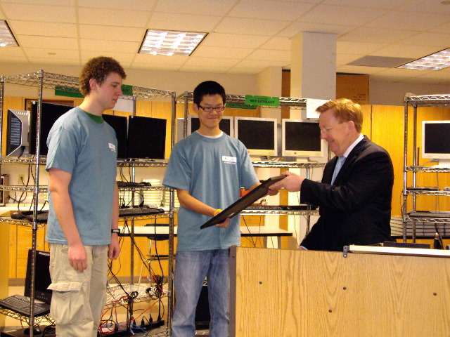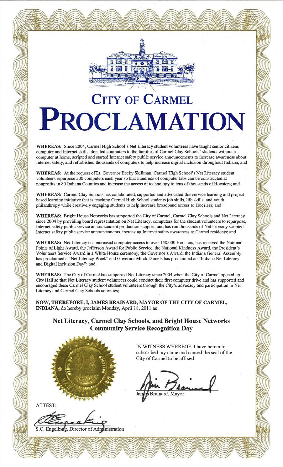 Mayor Jim Brainard will present the Carmel High School Net Literacy Student Volunteers with a Proclamation from the City of Carmel for their efforts refurbishing computers that were donated to students in the Carmel Clay School District who were without computers at home. In addition, they will be recognized for leading the effort to increase Internet Safety Awareness in Carmel and Central Indiana by creating an Internet Safety Public Service Address (PSA) awareness campaign. Currently, the PSA campaign airs on Bright House Networks. Mayor Brainard will also present a proclamation on behalf of Governor Daniels proclaiming “Indiana Net Literacy and Digital Inclusion Day,” recognizing the Carmel High School students’ contributions in a three year initiative. The initiative provides thousands of computers to hundreds of libraries, community centers, and nonprofits in more than 80 Indiana counties.